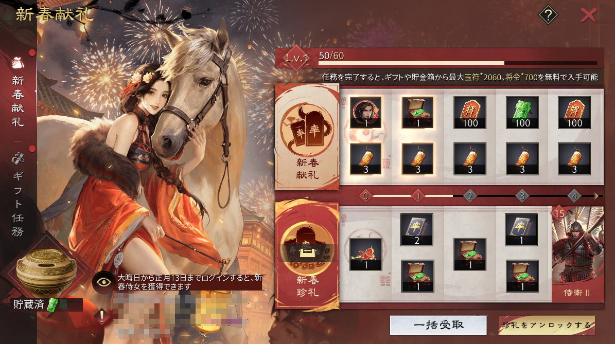 - イベント期間中、【新春珍礼】を購入してアンロックすると、永久の吹き出し、召募状、百姓珍礼、★5侍衛などの報酬を受け取れます。