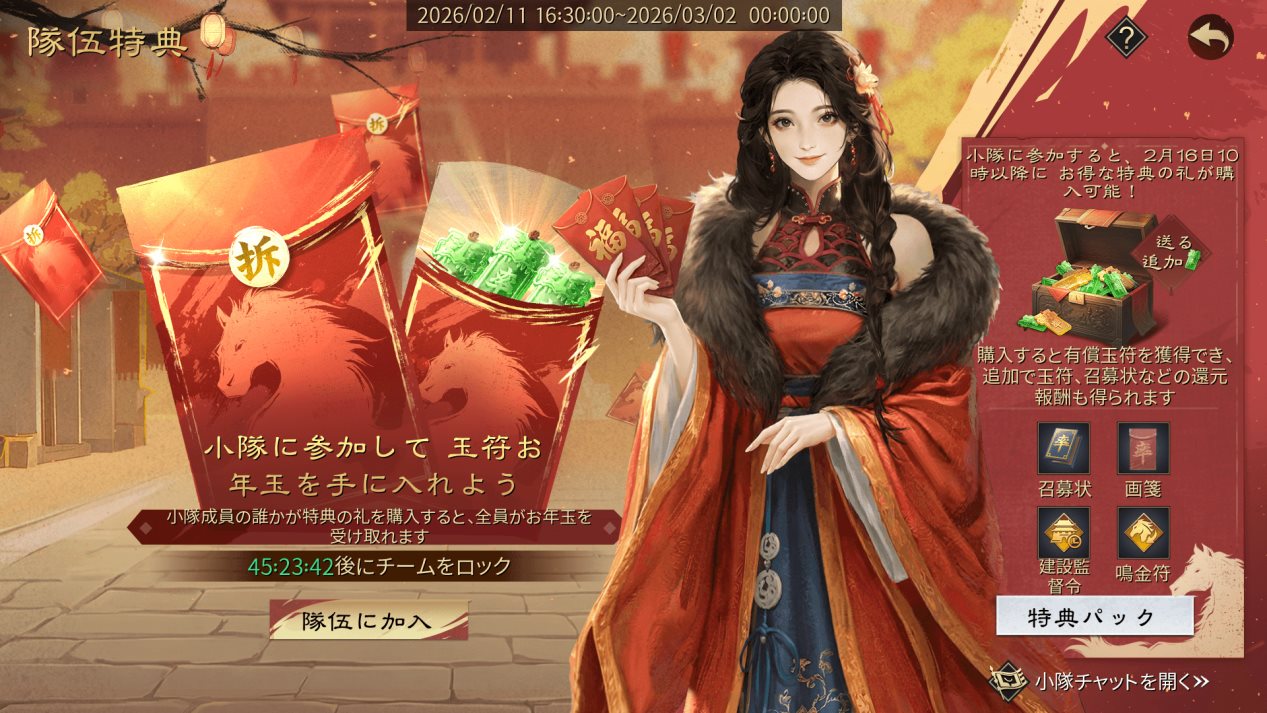 -小隊に加入した主公は、2月16日11:00(UTC+9)以降、、「出会いの礼」と「特典の礼」を購入できるようになり、有償玉符、追加虎符、召募状などのお得な報酬を獲得できます。