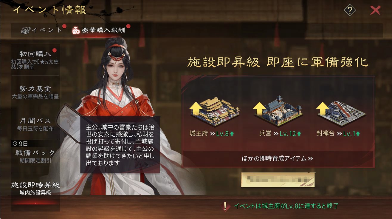 サーバーオープン日数が15日未満、かつ城主府がLv.8未満の場合、君主は施設昇級パックを購入できます。これにより、主城施設のレベルをさらに向上させることができます。パック購入後の施設昇級レベルは以下の通りです: