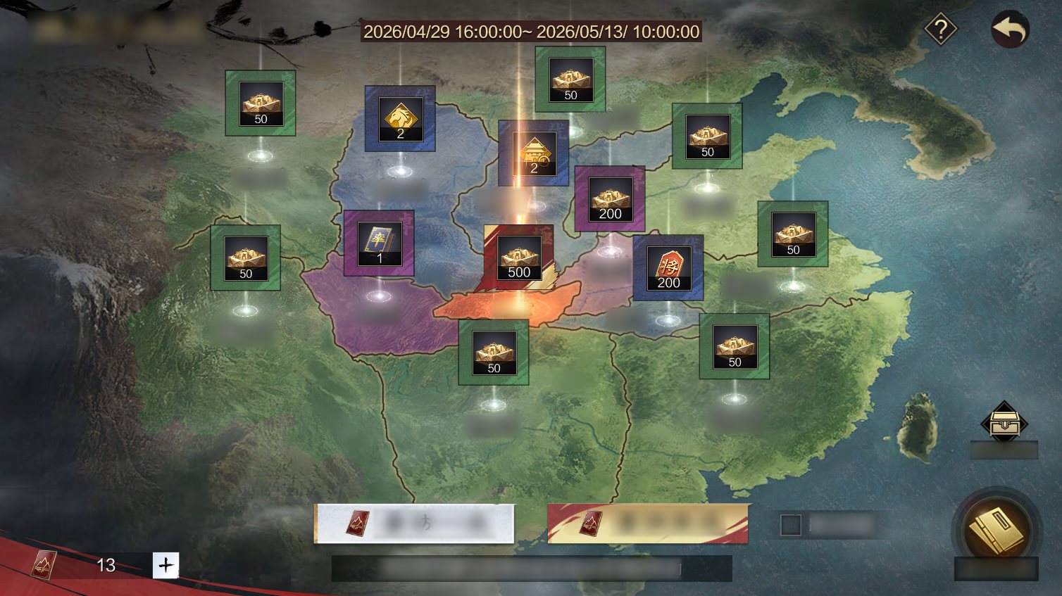 イベント内容:期間中、新イベント「十三州遊歴」を開催します。「探訪令」を消費し、十三州をランダムに遊歴できます。主公が遊歴された州に応じて、システムが対応する賞品を進呈します。司隷に遊歴された場合、司隷の最高賞を獲得すると同時に、他の全州の未獲得賞品を即座に獲得でき、次のラウンドの新たな遊歴へ進むことができます。各ラウンドの遊歴において、同じ州に重複して訪れることはありませんので、遊歴を重ねるごとに、司隷にたどり着く確率が高まっていきます。